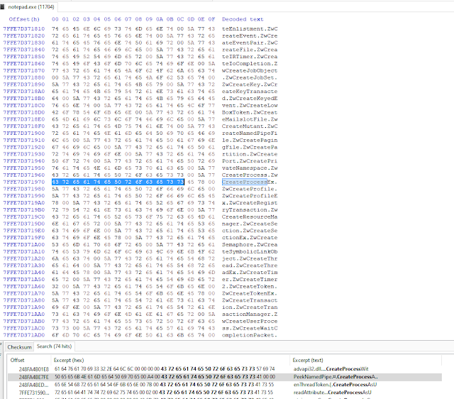 Checking the process in hxd I search for some of those functions which the malware used to create spoof parent process